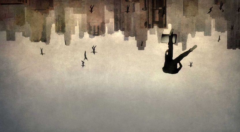 With one foot already on the sill, Bob turns around with a confident grin. “Don’t worry,” he assures the panicked crowd. “I don’t believe in gravity anymore!”
